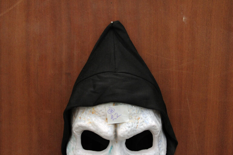 Mass Panic, 2022 MDF, Wooden offcuts, Charity shop Halloween mask 126cm x 191cm