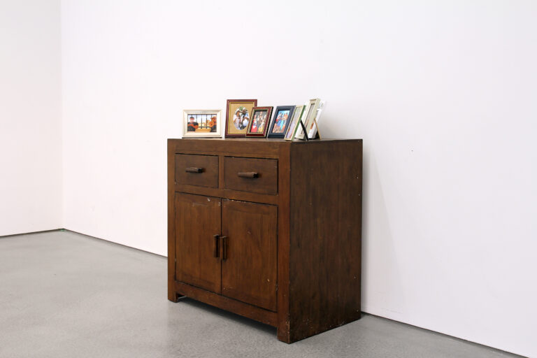 Object Permanence, 2022 Street foraged chest of drawers, Charity shop photo frames, Digital photo prints of text generated images using DALL.E Variable dimensions